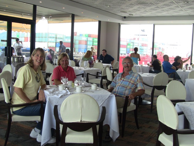 Sharon and the Imajica crew, Judy and Doug, at the Miraflores Locks Restaurant