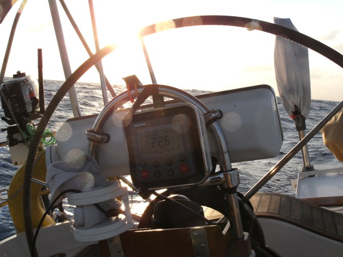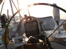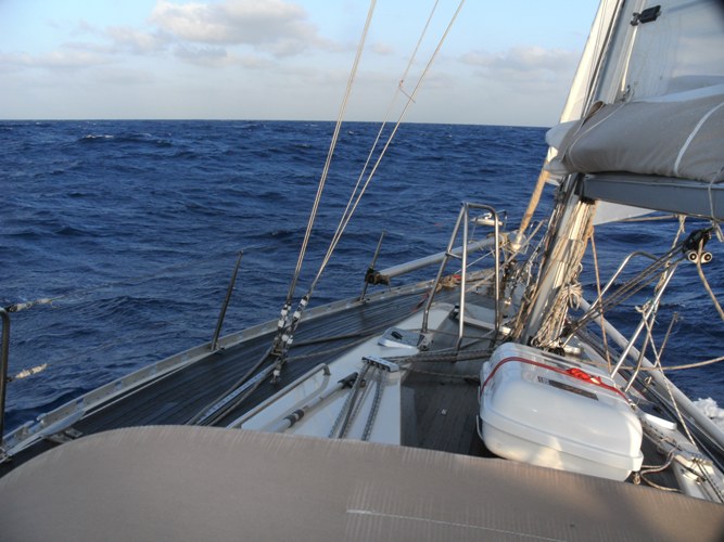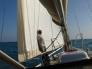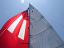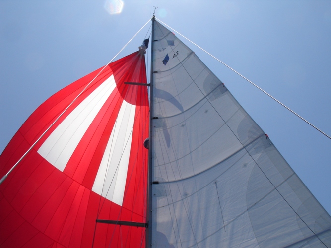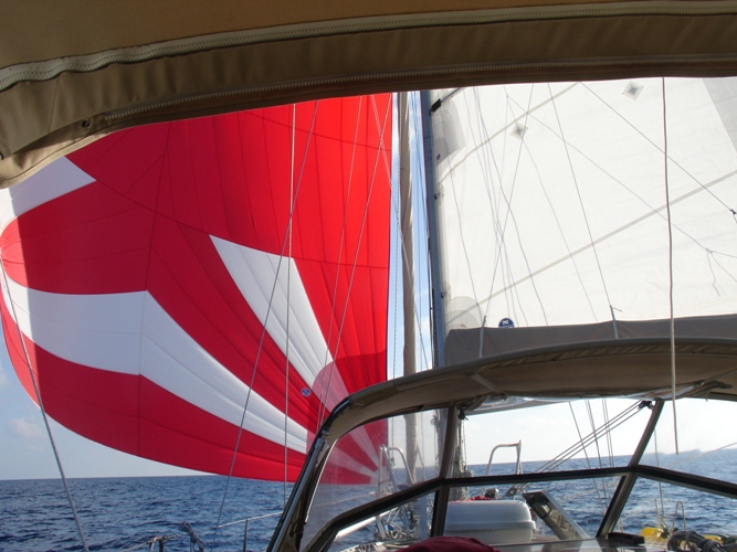 Today there is not much wind so we are using the main sail and the genaker (red and white). The genaker alone has almost 900 square feet.